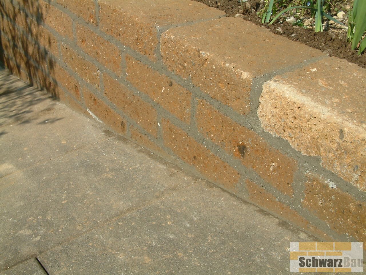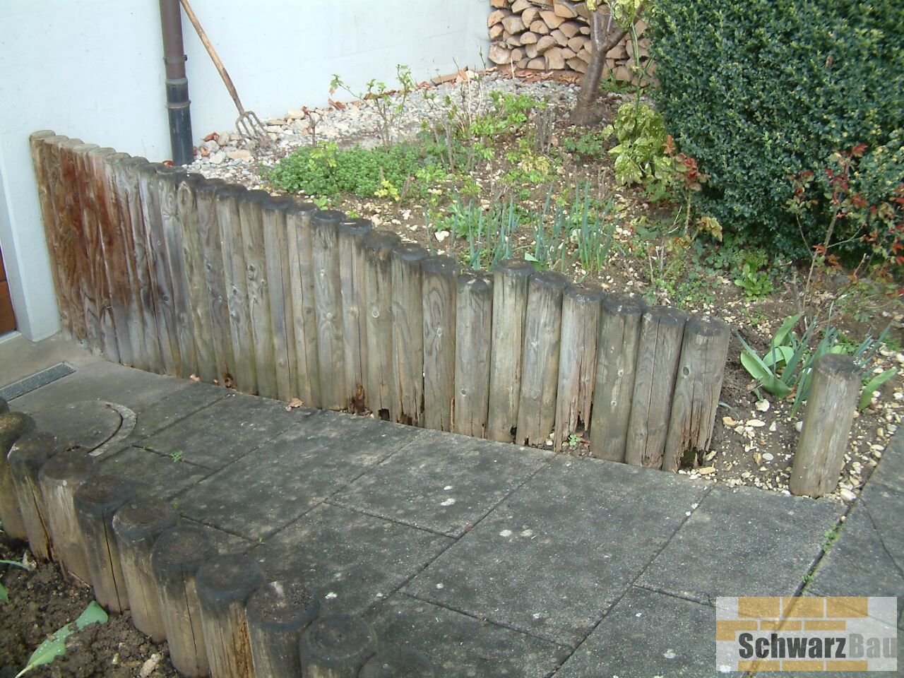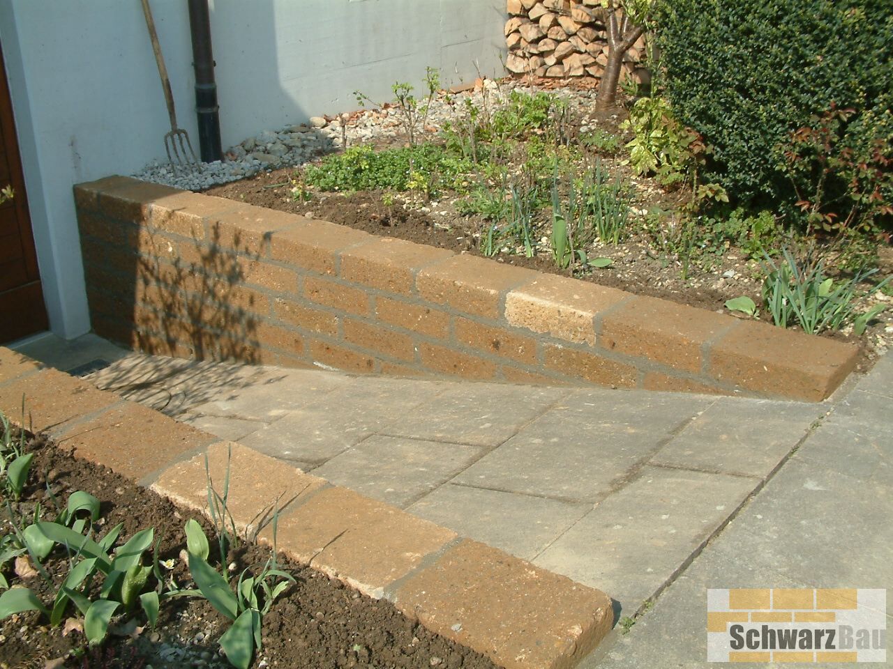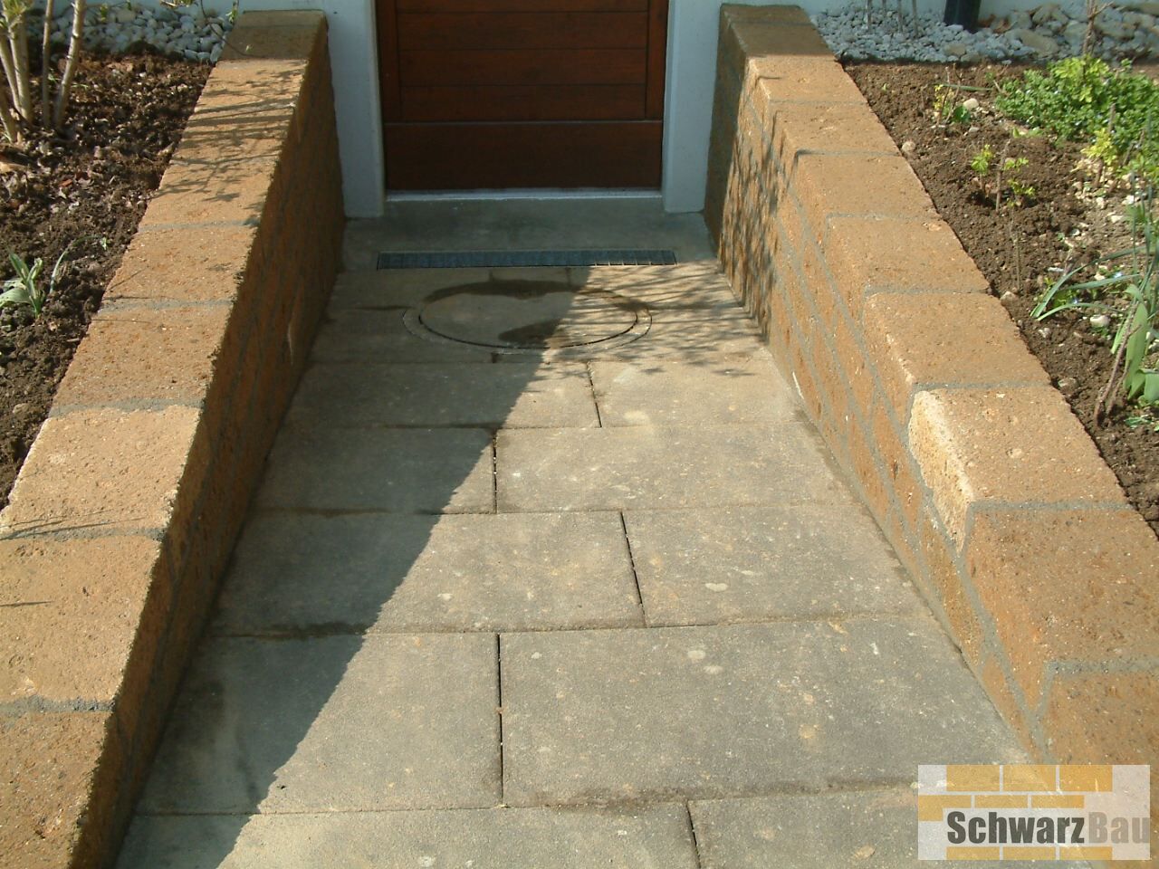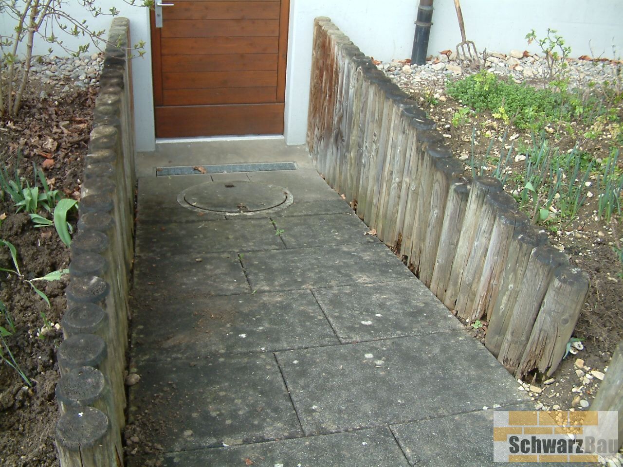 Die neue Oberfläche verleiht dem Eingangsbereich eine edle Optik und deutlich verbesserte Trittsicherheit. Zusätzlich wurde bei einem Kellerabgang die veraltete Holzpalisade entfernt und durch eine solide, dauerhaft schöne Tuffsteinmauer ersetzt. Diese ist nicht nur pflegeleichter, sondern fügt sich auch harmonisch in die Umgebung ein.